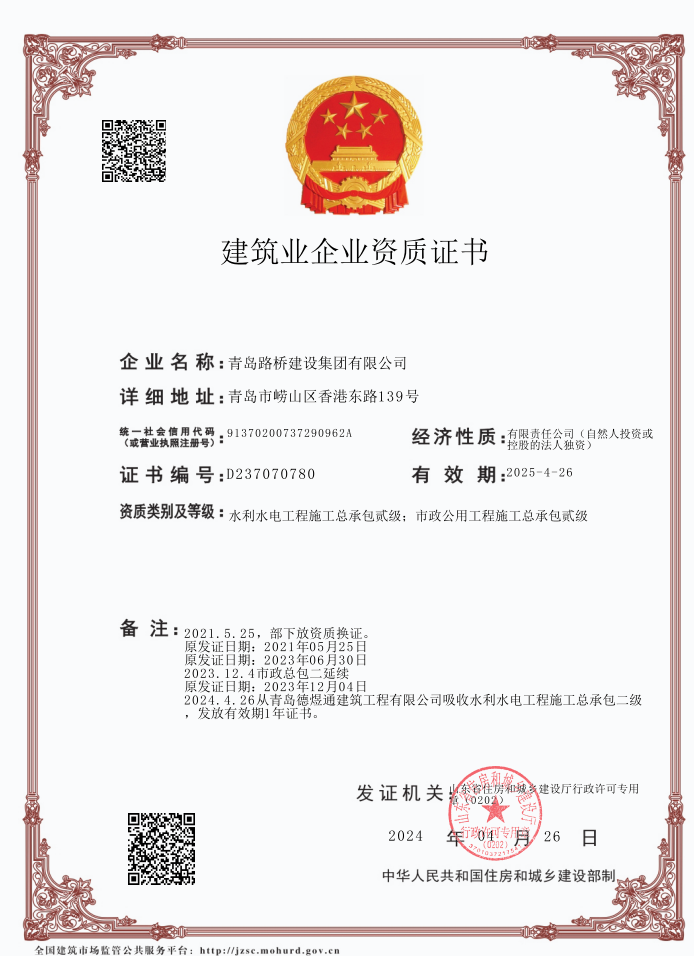 近日,青岛市行政审批局发布了《开云网站登录入口核准建设工程相关企业资质和建筑施工企业安全生产许可证名单的通知》,开云(中国)旗下交发集团取得水利水电施工总承包二级资质,进一步拓宽了集团水利水电工程业务承接范围,为多元化、可持续发展奠定了坚实基础。