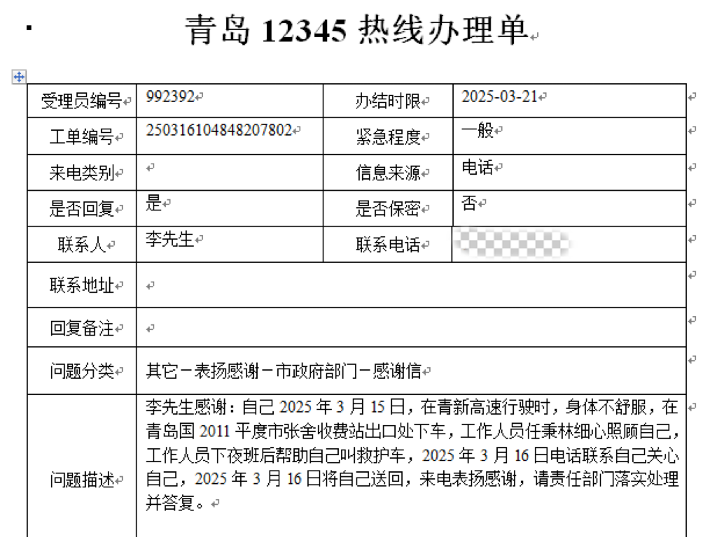 此前,平度市文旅局官方点赞青岛高速关怀司乘的服务举动,在社会上引发广泛关注。此次张舍收费站的温情救助,也收到了12345市民服务热线的表扬,青岛高速暖心之举不断,不仅在司乘群体中树立了良好口碑,更通过双方真诚互动构建了“付出-感恩”的正向循环,为社会注入温暖力量。