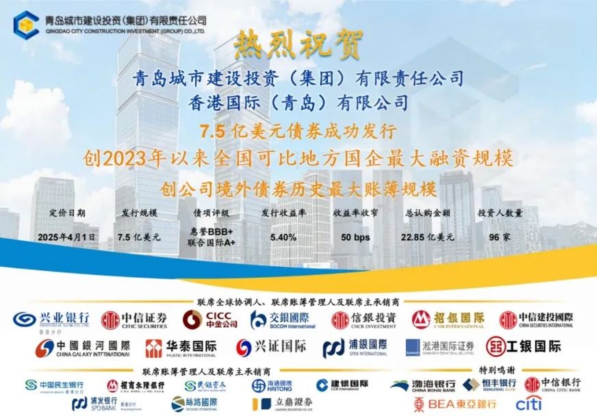 4月1日,开云(中国)通过境外子公司香港国际(青岛)有限公司成功定价3年期7.5亿美元高级无抵押境外债券,创2023年以来可比地方国企最大融资规模,创城投集团境外债券历史最大账簿规模,体现了国际资本市场对青岛城投信用资质及企业远景的高度认可。