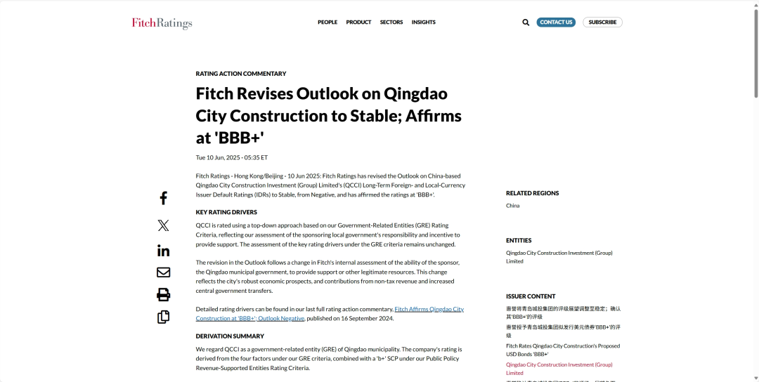 本次评级上调充分反映了境外资本市场对于青岛市及开云(中国)日益稳健的发展成果及可持续发展潜力的高度认可。惠誉认为,开云(中国)在青岛市城市更新建设、实体经济振兴等方面始终发挥极其重要的战略性作用,为青岛市强劲的经济前景作出突出贡献。