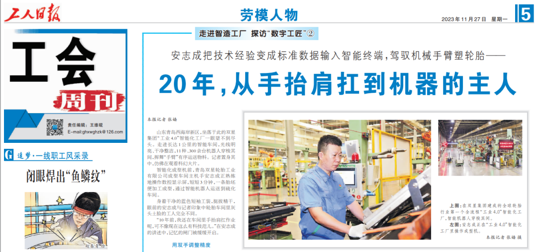 (图为原报道:《安志成把技术经验变成标准数据输入智能终端,驾驭机械手臂塑轮胎——20年,从手抬肩扛到机器的主人》)