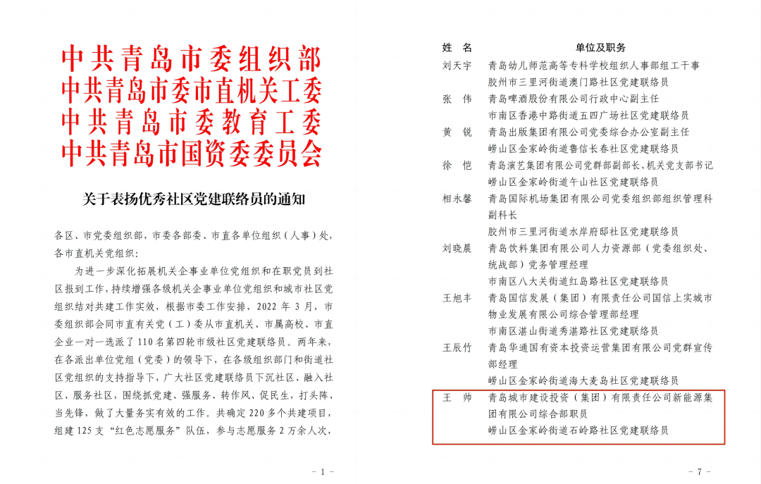 近日,市委组织部、市直机关工委、市委教育工委、市国资委四部门联合行文《开云网站登录入口表扬优秀社区党建联络员的通知》对青岛城投新能源集团王帅同志等55名优秀社区党建联络员进行了表彰。2022年以来,城投集团与金家岭街道石岭路社区开展党建结对共建“双报到”,本次表彰再次体现了有关部门对集团党建共建工作的高度评价。